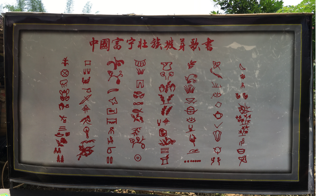 5月17日上午,蒋院长一行在《坡芽歌书》的发现者之一黎盛根主任的陪同下,专程来到距离古镇剥隘新址9公里的坡芽村深入考察。《中国富宁壮族坡芽歌书》(简称《坡芽歌书》),是流传在云南富宁壮族地区以原始的图画文字将壮族民歌记录于土布上的民歌集,它是迄今为止发现的唯一用图画文字记录民歌的文献,由81个图画文字构成,曲调抒情优美,鲜明体现了壮族作为稻作民族的诗性思维特点和艺术表现技巧,具有十分浓郁的民族地域特色。《坡芽歌书》在文字形态上比东巴文字更古老;在文学形态上,具有《诗经》的韵味;《坡芽歌书》的文字印证了文字发展的过程,是祖国民族文化的瑰宝。